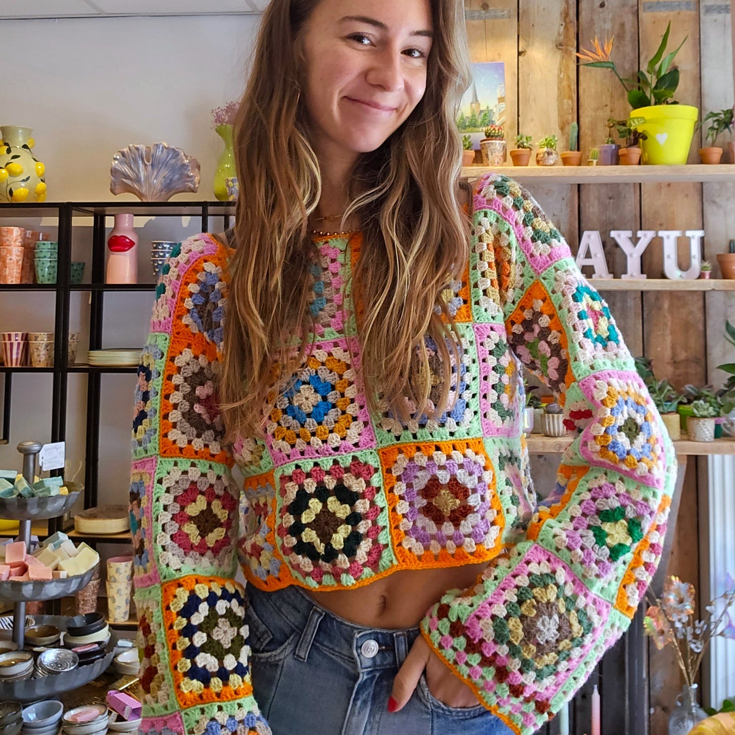 Gehaakte trui - groen/oranje/roze